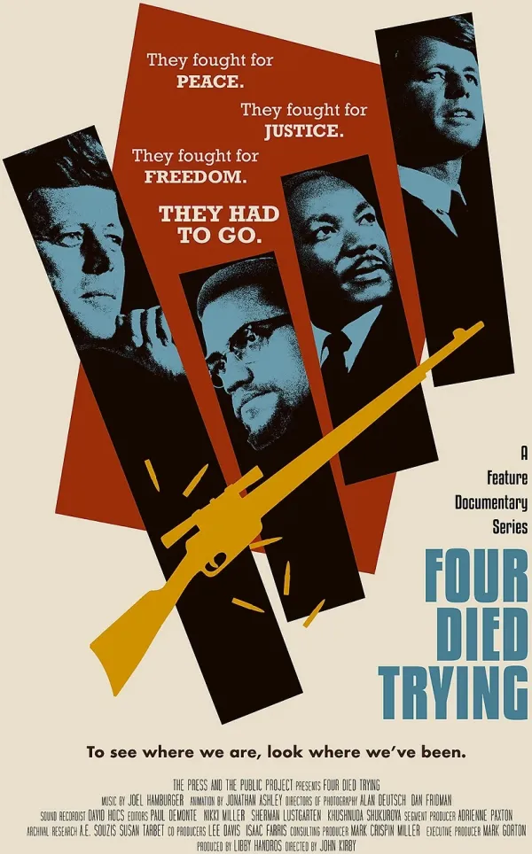 Four Died Trying is a feature documentary series that explores the extraordinary lives and calamitous deaths of President John F. Kennedy, Senator Robert Kennedy, the Reverend Dr. Martin Luther King, Jr., and Malcolm X. For this, you can watch the trailer, and then a planned 20 episode series.