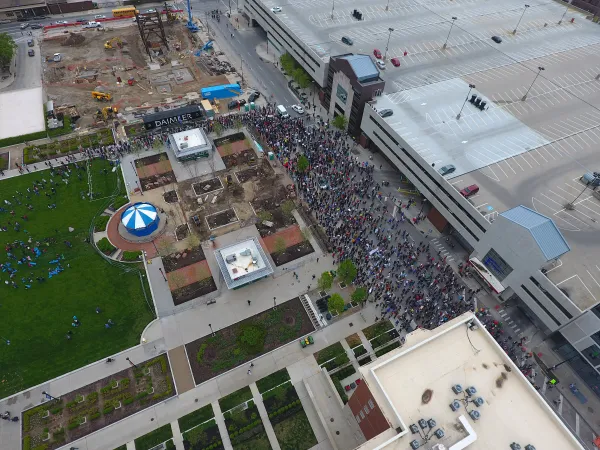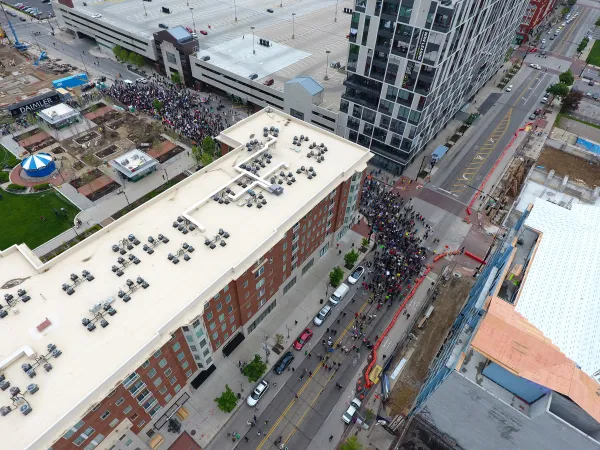 Downtown street with thousands of people marching