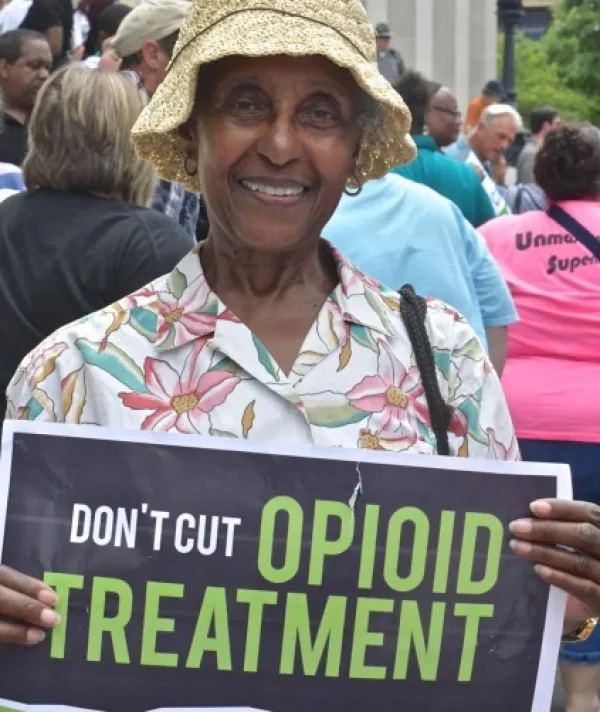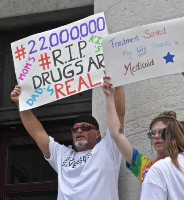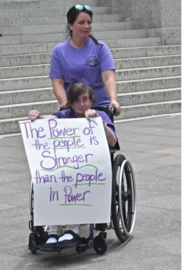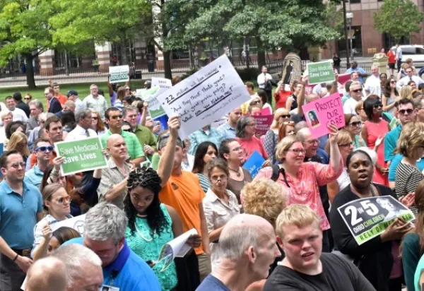 Person holding a sign against the Medicaid cuts at the statehouse with lots of other people