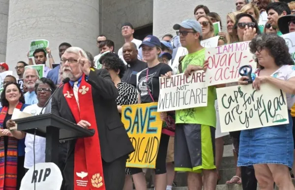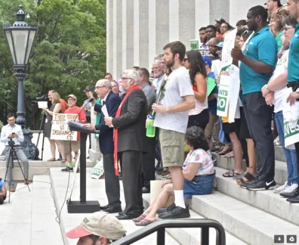 Concerned citizens met at the Ohio Statehouse at noon on Wednesday, July 5 for a Save Medicaid Save Lives Rally to protest the fact that Ohio’s legislature passed a budget bill that freezes enrollments in expanded Medicaid after July 1, 2018. The bill has been passed to Governor Kasich, and he is expected to veto the language that freezes enrollments. If that happens, the legislature may have the votes to override his veto and pass the enrollment freeze into law. Under this bill, 500,000 Ohioans will lose access to health care. Next week will be our last chance to protect the Medicaid expansion in Ohio, according to ProgressOhio.