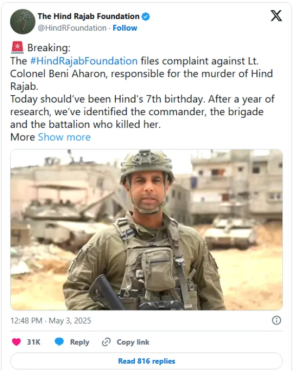Killer of Hind Rajab Identified: ICC Complaint Filed against Israeli Officer Photo credit. Palestine Chronicle