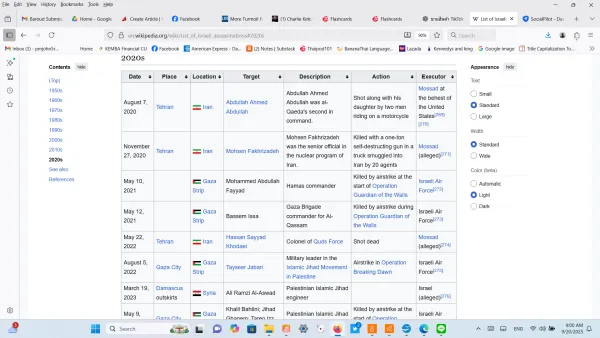 Wikimedia lists Israeli assassinations beginning in the 1950's. This is a screenshot beginning in 2020. It would require 5 screenshots to list all, beginning 2020.