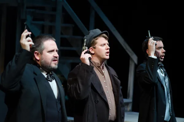 Presidential murderers (from left) Charles Guiteau (Scott Wilson), Leon Czolgosz (Jay Rittberger) and John Wilkes Booth (Ian Short) raise their voices and weapons in Assassins (photo by Dan Welsh) together are two awesome central performances.