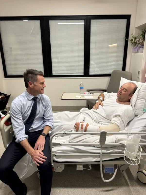 New South Wales Premier Chris Manns visits Ahmad Al Ahmad at the hospital. He tweeted, " Ahmed is a real-life hero. Last night, his incredible bravery no doubt saved countless lives when he disarmed a terrorist at enormous personal risk. It was an honor to spend time with him just now and to pass on the thanks of people across NSW."