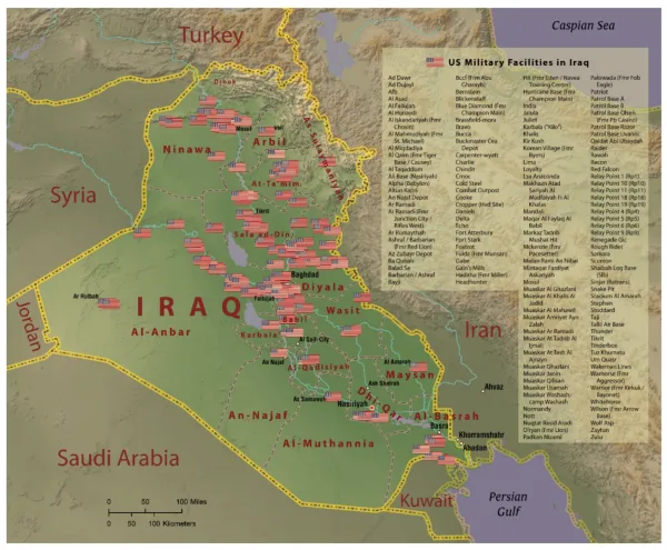 In the years following 2003, the U.S. military dotted Iraq with over 500 military bases, many of them close to Iraqi cities. These cities suffered the impacts of bombs, bullets, chemical and other weapons, but also the environmental damage of open burn pits on U.S. bases, abandoned tanks and trucks, and the storage of weapons on U.S. bases, including depleted uranium weapons. Here’s a map of some of the U.S. bases: