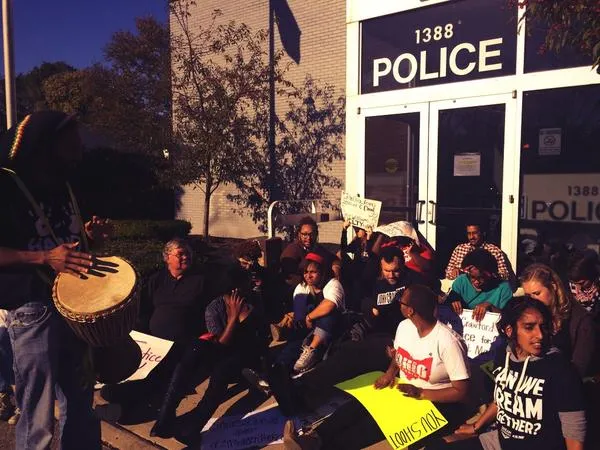 Members of the Ohio Students Association were confronted at 5pm today by officers in riot gear from multiple agencies after refusing to leave the Beavercreek police station. Earlier today, October 8, 2014, the students met with the police chief over demands following an officer-involved killing. Officers from Xenia, Greene County Sheriffs, Beavercreek, Fairborn, Yellow Springs and the State Highway Patrol were on hand to remove the protestors conducting a sit-in in front the station. Demonstrators tweeting from the scene noted the presence of at least two police K-9 units. Students had vowed to stay overnight but left when the police station closed after successfully shutting it down for several hours.