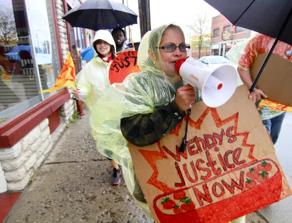 Farmworker Nely Rodriguez leads chants during the Ohio Fair Food march on Wendy’s Saturday (photo by Claudia Saenz)