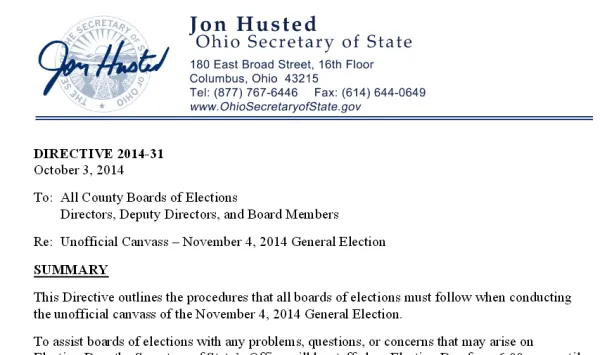 The new October 3 Directive 2014-31 also contains the following: “Prior to Election Day, you will receive a shipment of USB thumb drives for use on election night to ensure the security of your central tabulating system. As in the past, unofficial election results provided to the Secretary of State’s Office will be summary only, rather than precinct-level. Precinct-level results will be uploaded by boards of elections for the official canvass.”