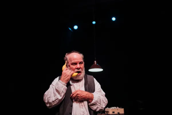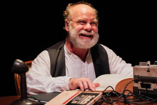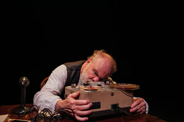 Porter, who played a wickedly witty bad Santa in The Gang’s 2018 Aphrodite’s Holiday Show, expertly transmits his humorous sensibility to Krapp’s with great panache. However, he also brings a tragic sensitivity to the role, which seems to be of an old man reviewing his squandered life. As Beckett’s title indicates, like the National Security Agency, the perhaps perfectly monikered Krapp has “surveilled” his own life, making audio dossiers of various episodes of his misbegotten, possibly wasted existence. Ensconced at a desk Krapp plays from reels of tapes on an ancient tape recorder. A Gang staffer assured me the dialogue on the tapes actually emanated from the hoary reel-to-reel machine and the spools - a word Krapp has much fun with - Porter’s character plays. Perhaps this touch is owing to the wizardry of technical director Josh Keh, as well as helmer Cynthia Ettinger, along with Porter’s expertise.