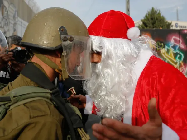 Santa is not taking no for an answer and is butting heads with an IOF soldier. Phot credit: aljazeera.com
