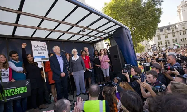 Hours after being elected leader of the Labour Party, Corbyn spoke on Saturday at a huge pro-refugee rally in Parliament Square, and blamed the refugee crisis on its cause, declaring that he would not support the past policy of rushing about the world launching wars.