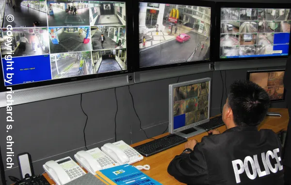The police station's internal CCTV shows a cluster of uniformed