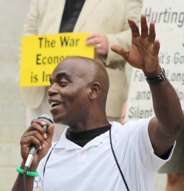 Adrienne Hood was uniquely qualified to speak on May 29 about the war economy, militarism, and the proliferation of gun violence. “I’m wearing two hats,” she said. “I’m an active service member. But I’m also the mother of a young man who was gunned down by Columbus police. So I experience both the military and militarization. It’s a struggle.”