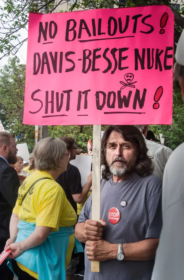 More than a hundred people gathered outside the Public Utilities Commission of Ohio (PUCO) headquarters today, June 15, trying to stop the bailouts of dirty coal plants and the Davis-Besse nuclear plant in Ohio. The rally was tightly controlled by the Ohio Sierra Club, who sent five members inside to deliver letters to the PUCO meeting. The outcome of the decision is not yet known. For more information on the issue, please see: No bailouts for First Energy’s Davis-Besse nuclear reactor by Pat Marida, chair, Ohio Sierra Club Nuclear Issues Committee.
