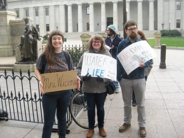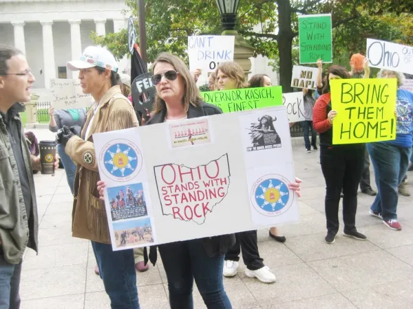 On November 4 supporters of the North Dakota Sioux from across Ohio gathered at the Statehouse to call on Governor Kasich to recall state troopers from Standing Rock. The demonstrators chanted, “Mni Wiconi!” (Lakota for “water is life”).