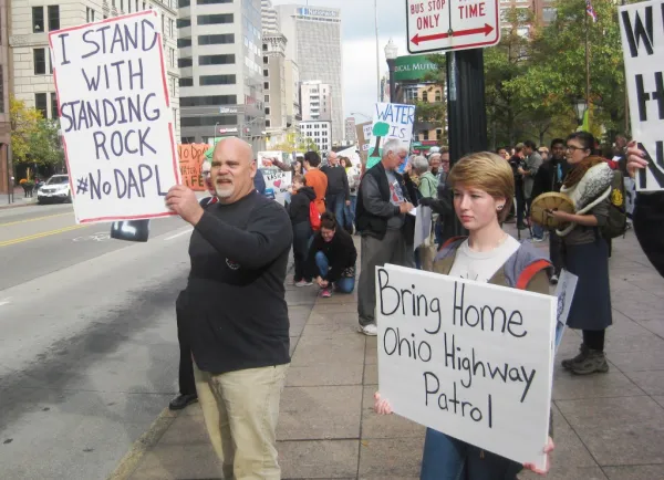 “I came to the rally both to publicly support indigenous people and other water protectors in their struggle against DAPL in North Dakota, as well as to voice my opposition to Ohio sending taxpayer-funded state troopers to defend for-profit dirty energy corporate interests by suppressing free speech and assembly,” said Bob Hart, who ran for Ohio District 12 in the U.S. House of Representatives in 2014.