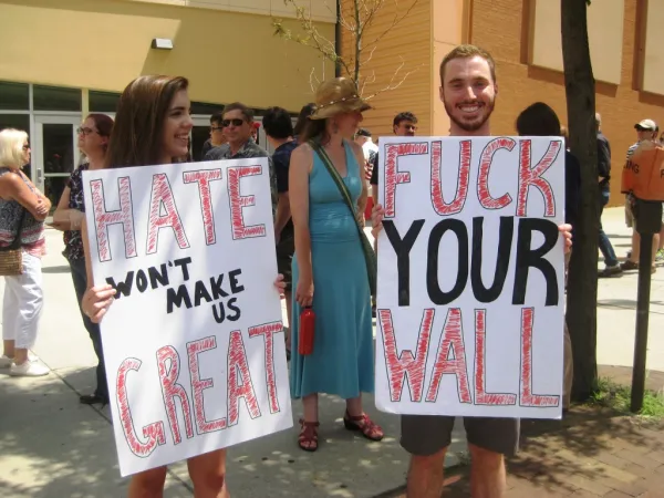 Protest organizer Rubén Castilla Herrera also had a bullhorn. “We’re black, brown, white, queer, straight, immigrants, women, men,” he said. “We’re a diverse community, and we’re to tell you that Trump is not welcome here!”