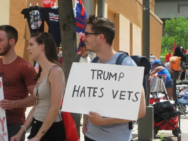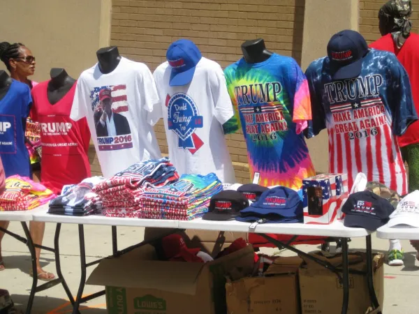 One merchandise hawker tried to turn the setback into an opportunity. “$5 off all Trump gear if you couldn’t get in!” he shouted over a bullhorn. Then he started to heckle protesters across the street who held signs saying “Wall off Trump,” “Love Not Hate,” “Black Lives Matter,” and “No Más Trump.”