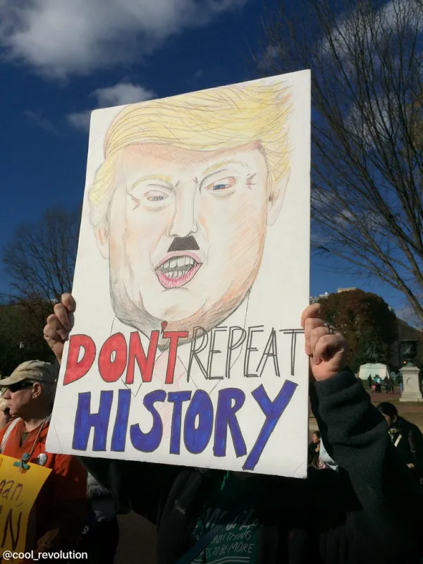 This leader often used inflammatory and hate-filled language in his speeches, actually inciting violence among his listeners, and was thus widely covered by the press as an aberration in the struggling, once-civilized, democratic nation. He amassed a devoted coalition of angry, under-employed, xenophobic white supremacists, especially among the millions of psychologically-wounded combat veterans from the last war who were easily recruited to participate in street-fighting for the cause. His followers revered and exuberantly pledged allegiance to the flag.
