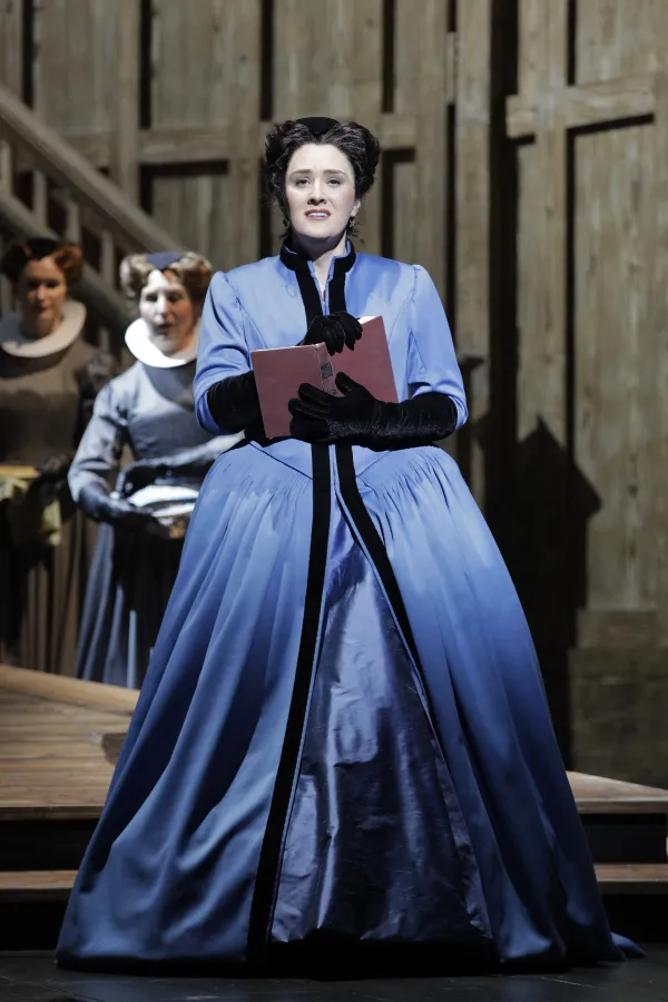 On Roberto’s opening night, LA Opera was faced with another crisis when one of its female leads was unable to take the stage. With that “the-show- must-go-on!” pizzazz, before the curtain lifted Feb. 22 on the Dorothy Chandler Pavilion’s stage, LA Opera CEO Christopher Koelsch announced that due to Davinia Rodriquez’s illness - which reportedly prevented her from playing Queen Elizabeth - Washington state soprano Angela Meade would replace the Spanish soprano in singing the royal role. Because of Ms. Meade’s late addition, as well as the extensive demands of the role, at the premiere of Roberto Devereux Ms. Meade sang the role of Elizabeth from the side of the stage while Nicola Bowie, the production’s choreographer, acted the role in costume and makeup onstage, a practice which - according to LA Op’s Director of Communications - shall continue throughout the show’s run.