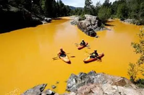 One view of the Animas River, a once famous Colorado trout river, after millions of gallons of toxic sludge spilled from an abandoned hard rock mine tailings pond (August 5, 2015), sending more than 880,000 pounds of heavy metals, including aluminum, arsenic, beryllium, cadmium, copper, lead, mercury and nickel and zinc (plus cyanide and asbestos) into a smaller tributary upstream. The Animas River eventually drains into the Colorado River.