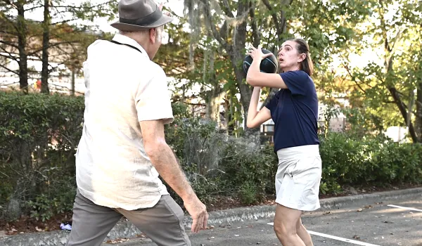 Carry Smith shoots a three-pointer over the head of reporter Palast at the Good Trouble bus, Savannah. Image credit Greg Palast