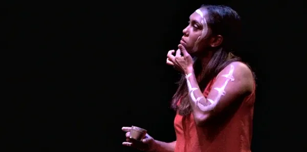 We also see our storyteller, Chenoa Deemal, a full-figured, pretty, youthful brown-skinned woman with long straight hair in a colorful dress. A sort of Down Under counterpart to African griots, Ms. Deemal proceeds to lead us through seven vignettes that shed light on the Aboriginal experience, after she has recognized the Traditional Custodians of the land here in Los Angeles - the Gabrielina, Tongva and Kich tribal peoples.