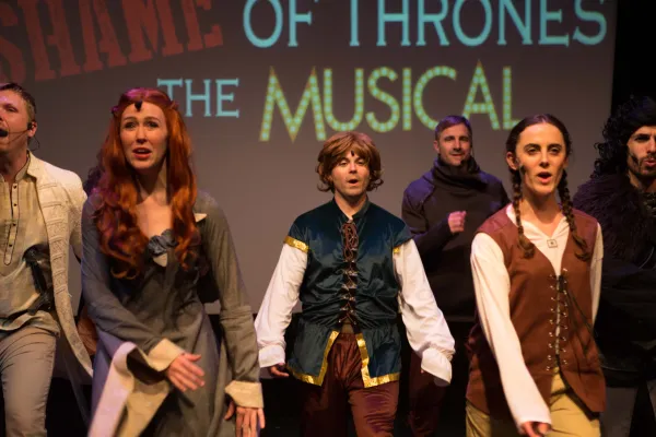Shame enjoys poking fun at the backstabbing and sexy hanky-spanky that were the hallmark of Martin’s novels and HBO epic about the cutthroat quest for the Iron Throne. The humor and story ranges from the satirical to slapstick to vaudevillian. Many of the popular long-running series’ beloved dramatis personae are impersonated in the musical parody, from saucy wenches to muscular knights and warriors.