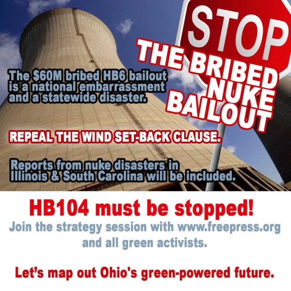 Discussion of THe $60 million bribed nuke bailout thanks to Larry Householder, how to work to repeal the wind set-back clause and reports from nuke disasters in Illiinois & South Carolina. Thousands of jobs -- forever cheap/clean/renewable energy ready to go!