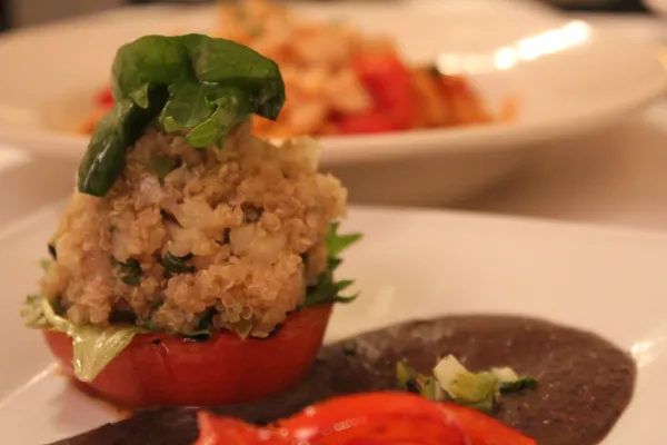 Pictured: Roasted Quinoa stuffed Tomato with roasted red bell peppers and black bean hummus, and pasta marinara with cannellini beans.