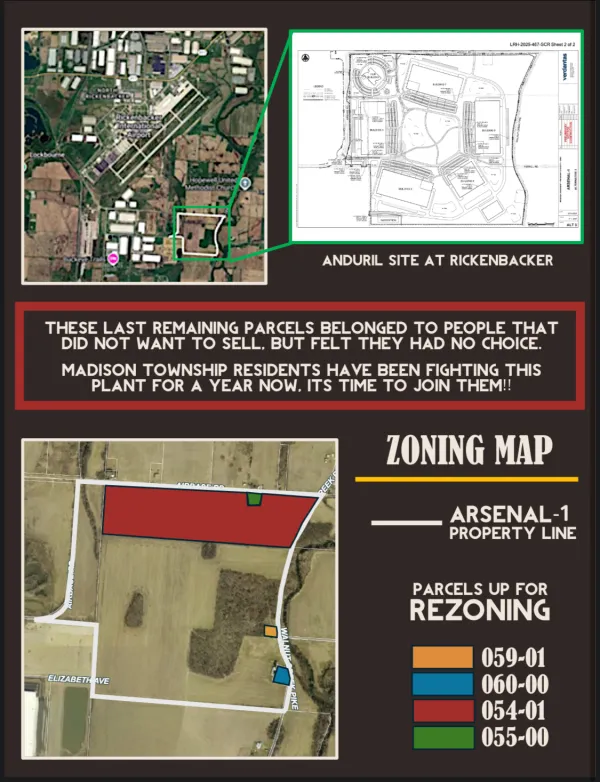 Protest outside the meeting of the Pickaway County Madison Township Zoning Commussion. They will be reviewing the last remaining land parcels for Anduril-1 Hyperscale facility.