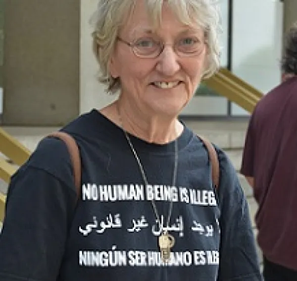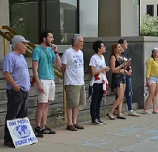 "No borders! No nations! Stop deportations!" A small but mighty group gathered across the street from the Hotel Leveque to protest Trump's announcement that deportations would be stepped up starting Sunday morning, June 23 in certain major US cities.  The protestors shouted at people coming out of the building that they should not stay in a building in which ICE (Immigration and Customs Enforcement) uses to hold immigrants in cells in that very building.