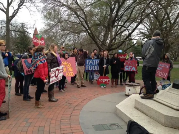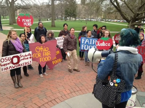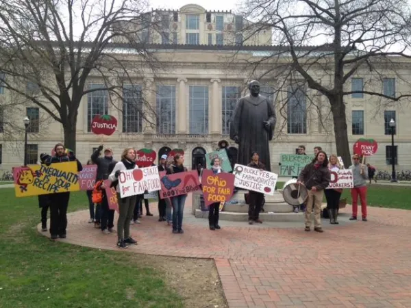 On April 15, 50 students and community allies lead by the Ohio State Student/Farmworker Alliance (SFA) gathered to deliver a message to the Wendy’s location on campus in the Wexner Medical Center: that they will not tolerate OSU’s continued business with Wendy’s; a company which refuses to support farmworkers in their supply chain. As readers of The Free Press recall, Columbus has become the epicenter of a national effort to have Wendy’s join its fast food competitors and join the acclaimed “Fair Food Program”, a partnership between farmworkers represented by the Coalition of Immokalee Workers (CIW), farmers, and 12 multinational corporations which guarantees farmworkers a substantial wage increase and provides an enforceable Code of Conduct outlining rights routinely absent in agricultural labor. Of the top five fast-food corporations in the nation -- McDonald's, Burger King, Taco Bell, Subway, and Wendy's -- Wendy's is the only one not participating in the Fair Food Program. It’s a new twist on a familiar story. The Free Press has been following the work of Ohio Fair Food, the local group organizing with the CIW, very closely. Since October The Free Press, unlike its corporate-backed peers at The Columbus Dispatch, has reported on the demonstrations, vigils, and marches that have been increasing in size and scope. Most recently, fair food allies from across the state and the nation converged in Columbus for an 800 person march through the streets of Dublin to Wendy’s corporate headquarters. Ohio State students have been a vital group supporting the CIW, showing up in increasing numbers at each action. Students have recently started taking matters into their own hands by applying pressure directed at the Wendy’s located on campus. Sara Stanger, a third year in International Studies, President of United Students for Fair Trade, and member of Ohio State SFA states, “We will not stand for our school to do business with a corporation that refuses to serve justice in its supply chain. We need to Boot the Braids from our campus.” “Boot the Braids” is not the first time Wendy’s CEO Emil Brolick has had to contend with student protests. During his tenure as President of Taco Bell, students at colleges and universities around the country mobilized to “Boot the Bell,” successfully ending 25 Taco Bell licensing agreements before the company signed with the CIW in 2005. The Ohio State SFA has been meeting with OSU Administration to discuss ending Ohio State’s lease with Wendy’s. This process which started in good faith two months ago but has slowed down with stalling tactics and no concrete progress on behalf of Administration to move toward justice and Ohio State’s motto: Disciplina in civitatem - Education for Citizenship. In response, Ohio State SFA quickly mobilized students to gather on the Oval, march to the Wendy’s location, and deliver the message there. When the manager on duty refused to accept the letter -- as they are instructed to do from Wendy’s corporate -- the crowd of 50 began chanting “Up Up with the Fair Food Nation! Down Down with the exploitation!”. “If Administration continues to drag their feet and fail to live up to Ohio State’s motto, they can expect that this will be the first of many actions.” said Andrew Lin, a graduate student in Environmental Science, “We will continue to put public pressure on OSU to do the right thing and end their business ties with Wendy’s who to this day refuses to support farmworker justice.” Indeed, as protestors marched out of the Wendy’s, the last thing they heard was the united cry “We’ll be back! We’ll be back!”