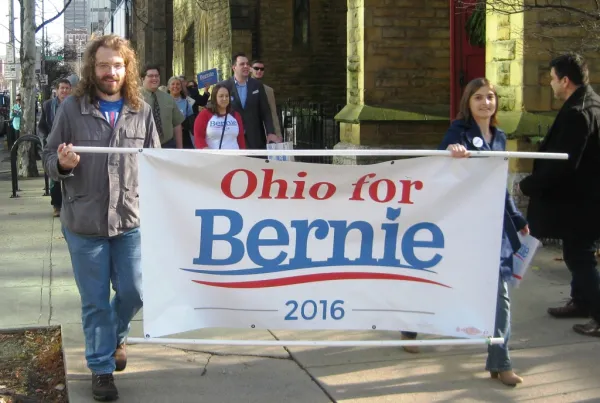 Bernie Sanders supporters march from the Secretary of State's office to the Ohio Statehouse.