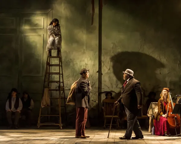 Brechtian, highly stylized, with agile if sparse sets by scenic designer