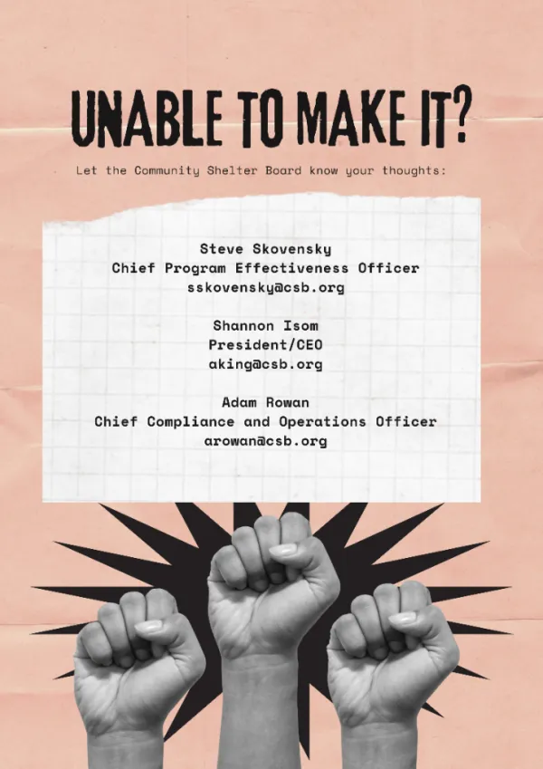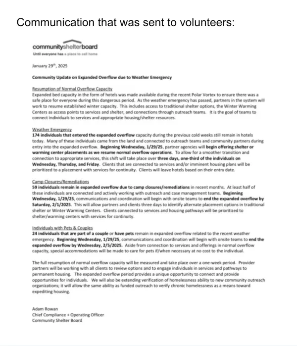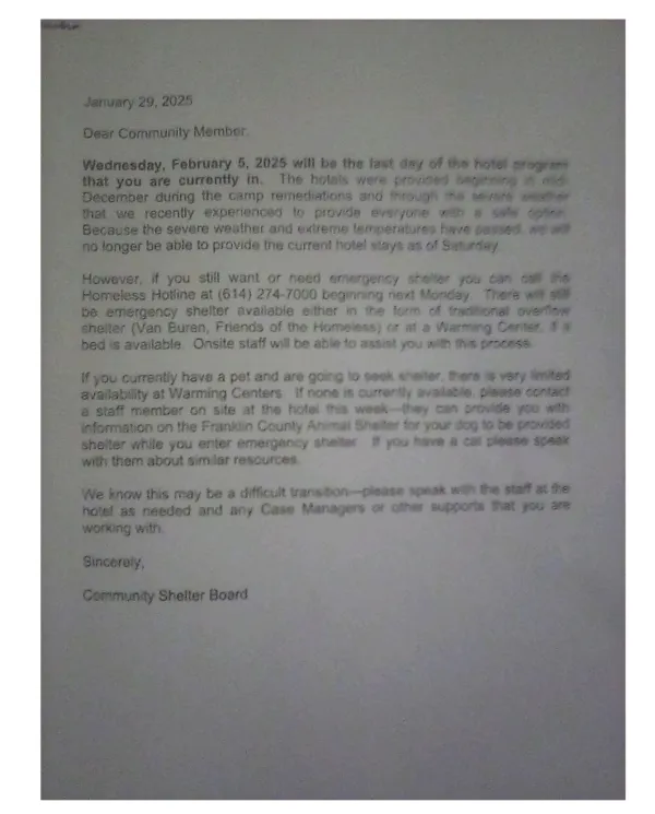 Yesterday, January 29, Community Shelter Board (CSB) upper management has ignited outrage after contacting volunteers announcing immediate eviction for hundreds of vulnerable individuals and families out of emergency hotel shelters. Residents received even less information, with notices posted on doors and no contact information provided for follow-up questions.