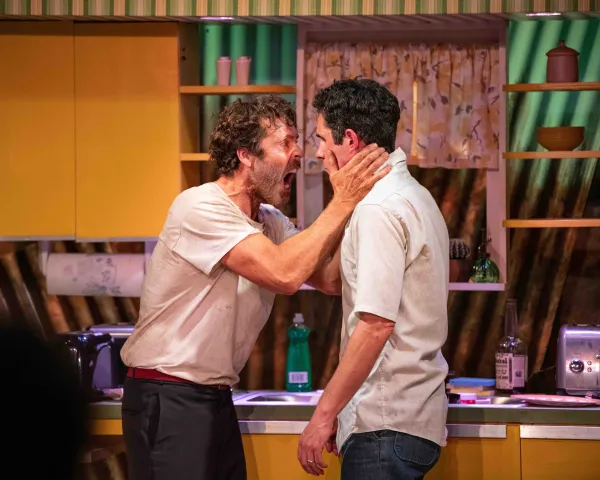 Without revealing plot spoilers, it’s not for nothing that this production employs someone designated as a “Violence Designer” (Ned Mochel, whose credits include working for the renowned Steppenwolf). By the end of this two-hour or so dizzying drama about trauma, the wrecked household is literally messier than any other stage I’ve ever laid eyes upon in my whole life. But I didn’t have to ponder what “technique” the cleanup crew used after each performance to straighten out the carnage of this ferocious True West: It was obviously the Kominsky Method.