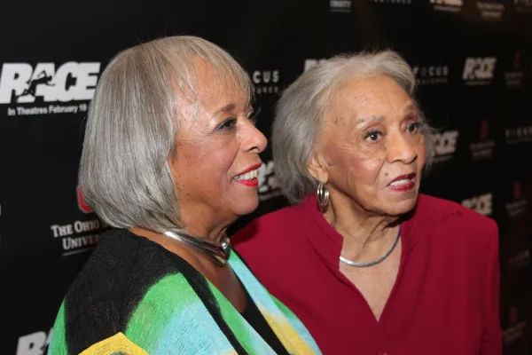 Jesse Owens’s daughters Marlene Owens Rankin (left) and Gloria Owens Hemphill attend an advance screening of Race at Ohio State’s Mershon Auditorium (photo by Richard Ades)