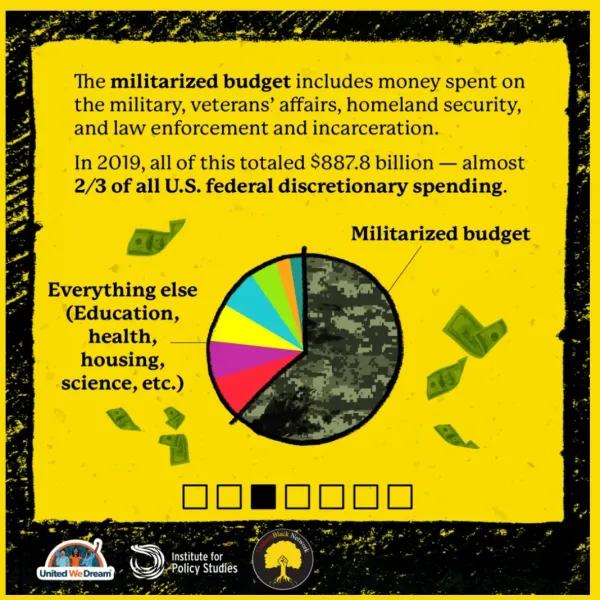 When you add in police and prisons, and the militarization of police and prisons — and of borders and airports — and the Veterans Administration, you’re talking about two-thirds of the money.