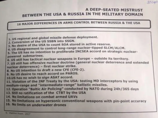 I attended a meeting in Moscow on Friday with Vladimir Kozin, longtime member of Russia’s foreign service, advisor to the government, author, and advocate for arms reduction. He handed out the list of 16 unresolved problems above. While he noted that the United States funds NGOs in Russia, as well as Ukraine, to influence elections, and described that as a reality in contrast to U.S. stories of Russia trying to influence a U.S. election, which he called a fairy tale, the topic did not make the top-16 list.