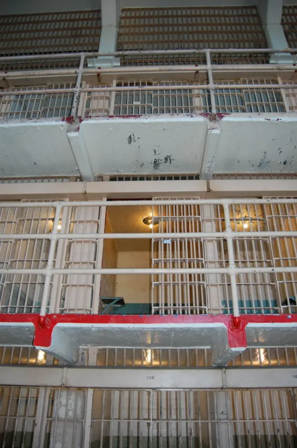 Following the prompts of the “Doing Time” audio tour, a perp walk (so to speak) through A- to D-block reveals the cellblocks to be three-stories high, consisting of grim rows of cheek-by-jowl narrow cages behind steel bar doors, the clanging of which suggests finality. Some of these doorways to hell are deliberately left open so visitors can enter to experience a brief taste of bleak prison life. Certain cells offered convicts tantalizing glimpses of San Francisco and the Bay; while these were the cubicles of choice for some, others were depressed by seeing an outside world they were, literally, barred from.