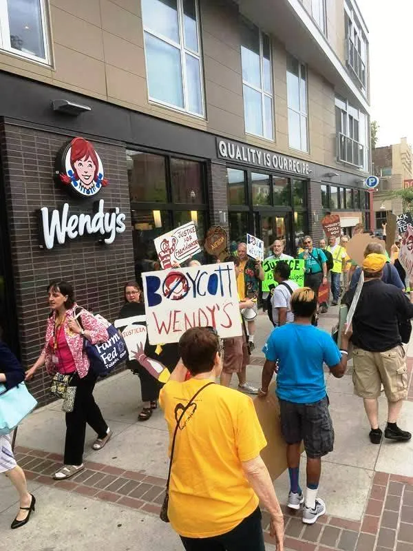 On June 22 over 50 Unitarian Universalists gathered outside the Wendy’s on Woodruff & High calling attention to the nation-wide boycott of the Ohio-based fast food chain. The protest happened in tandem with the Unitarian Universalist Association, with hundreds of thousands of members worldwide, officially endorsing the Wendy’s boycott.