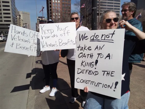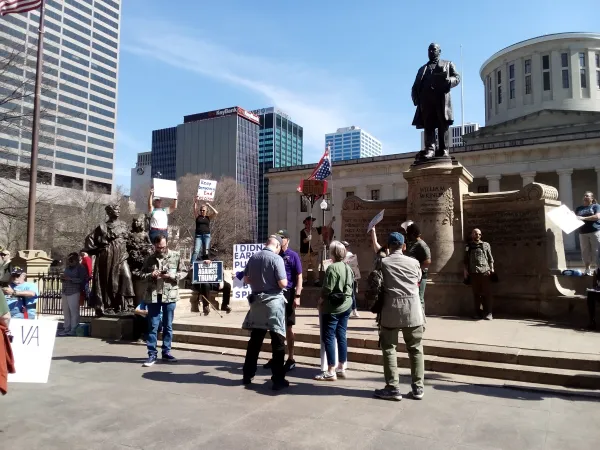 Veterans of all ages and their supporters lined the sidewalk from State to Broad Street in front of the Ohio Statehouse protesting the proposed Trump administration cuts to federal Veterans Administration (VA) jobs.