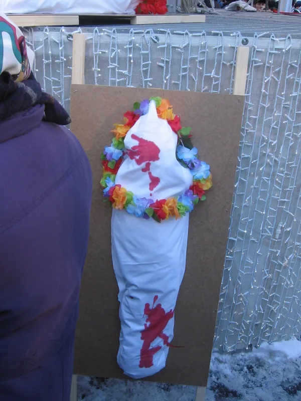 "Symbolic shroud for dead Palestinian baby" by humbleslave is licensed under CC BY-ND 2.0.