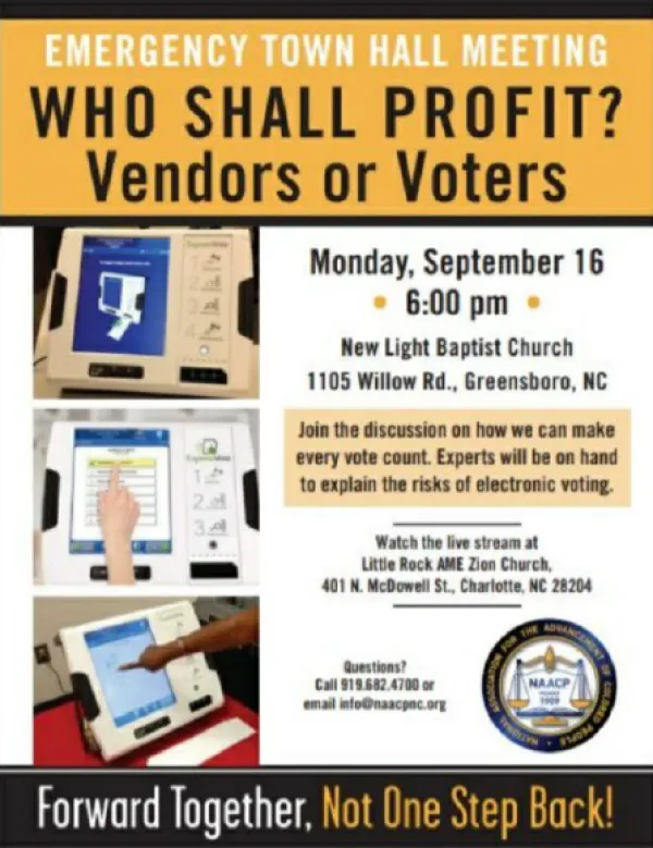 On Monday, September 16, 2019 in Greensboro, North Carolina an Emergency Town Hall meeting was presented by the North Carolina NAACP.  An network audience of churches across the state was introduced to a distinguished panel of election integrity advocates and computer security experts who shared their experiences and warned of the risks of electronic voting. The New Light Missionary Baptist Church fascilitated the event that attracted local citizens, officials, advocates, and subject matter experts.
