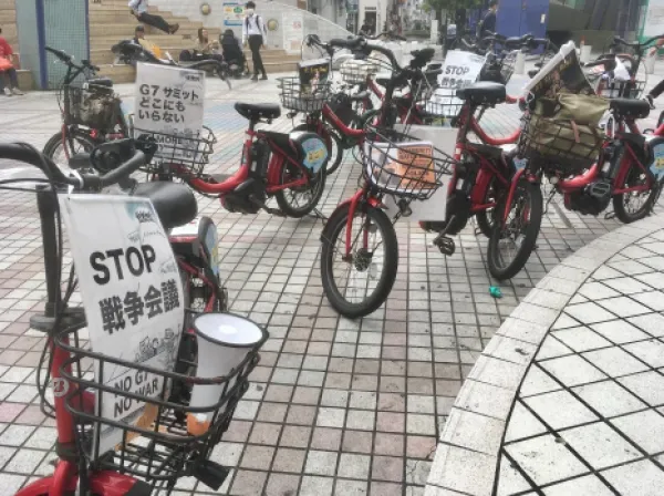 With feelings such as this, over a dozen of us decided to try something different. On Saturday the 20th,we rented “Peacecles” (peace+bicycles), put placards on our bodies or on our bicycles, rode around the City of Hiroshima, stopping occasionally to give our message orally with a loudspeaker, and joined peace marches. We really did not know how it would turn out, or if we would be able to do carry out our plan amidst the heavy police presence, but in the end, it proved to be a pretty fun way to protest. The bikes provided us with extra mobility and allowed us to cover a lot of ground in a short amount of time.