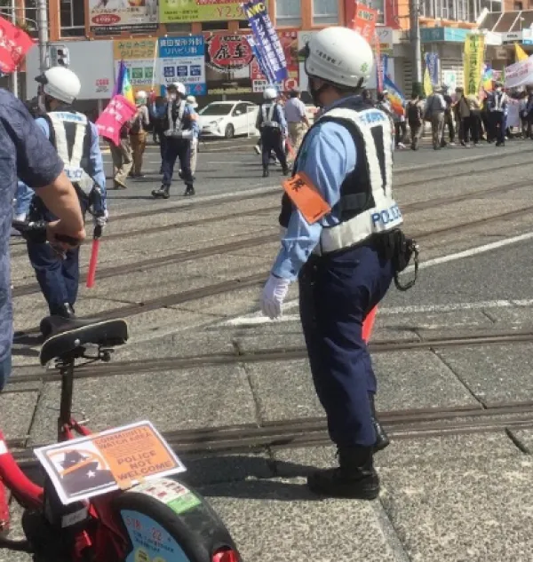 We were stopped at this spot, which was a checkpoint for people heading to Ujina. To me, the many questions from the police seemed fruitless as far as our group was concerned, so after 5 minutes or so, I said something to the effect of, “OK, there is no freedom of expression in this district. I see.” And I turned around and headed for Hiroshima Station, which was in the opposite direction, in order to send off some of our members. People were unable to exercise their right to freedom of expression, and although some of our members spoke to the police at length, they could not provide to us any explanation of a legal basis for preventing our members from proceeding on this public street and expressing our opinions about the Summit in the Ujina district.