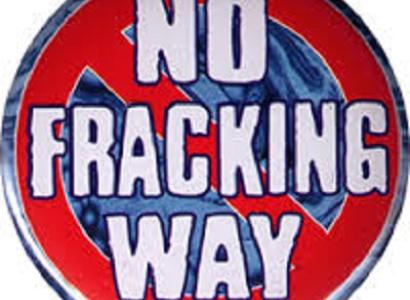 No Fracking Zone sign like a Yield sign and a photo of a fracking site